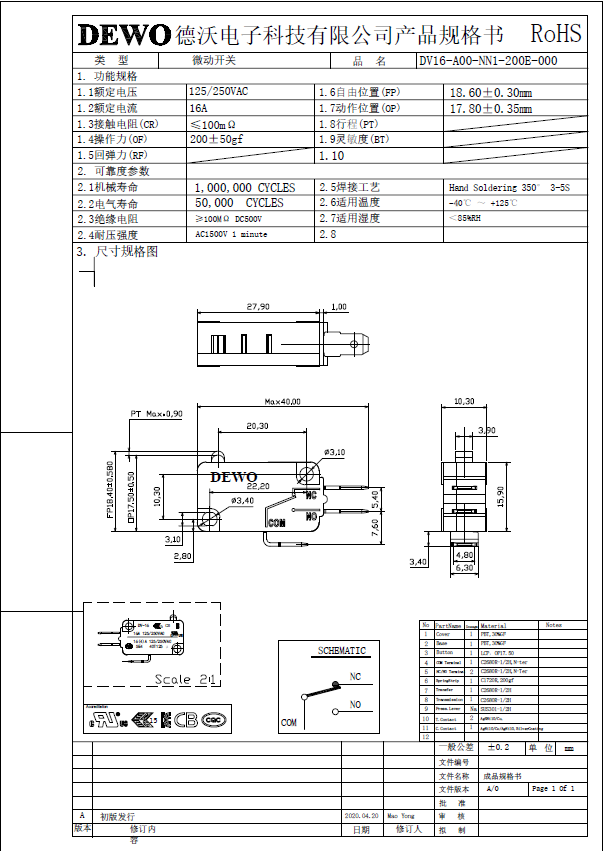 DV-16-A00-NN1-200E型微動開關